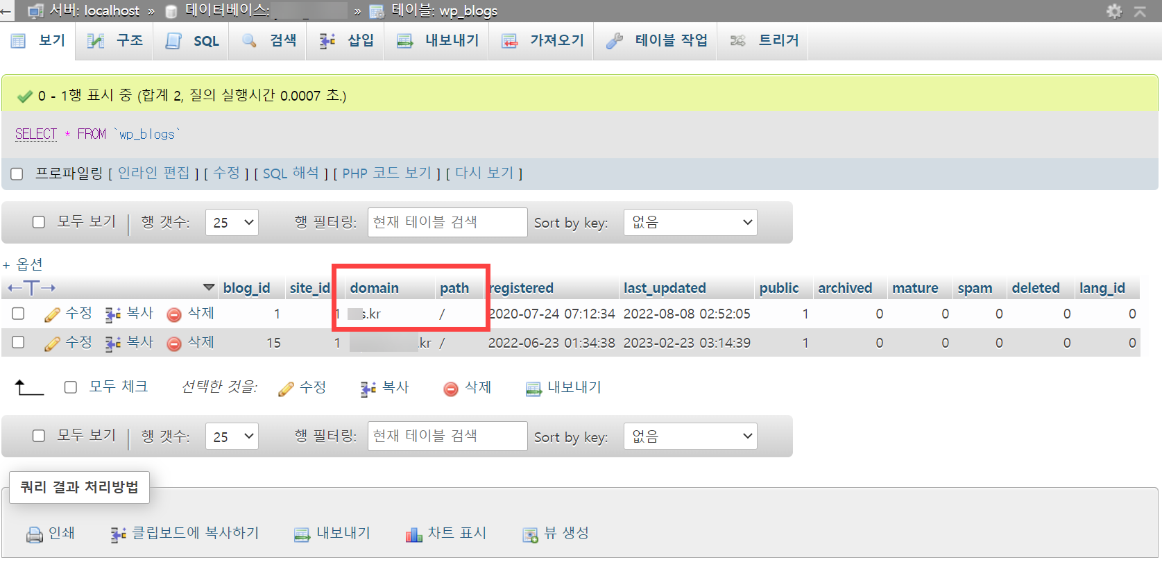 phpMyAdmin에 접속하여 wp_blog와 wp_sites에서 도메인 설정과 사이트 경로 설정을 확인할 수 있습니다.
