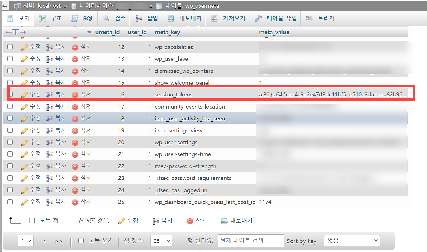 phpMyAdmin에서 session_tokens 삭제
