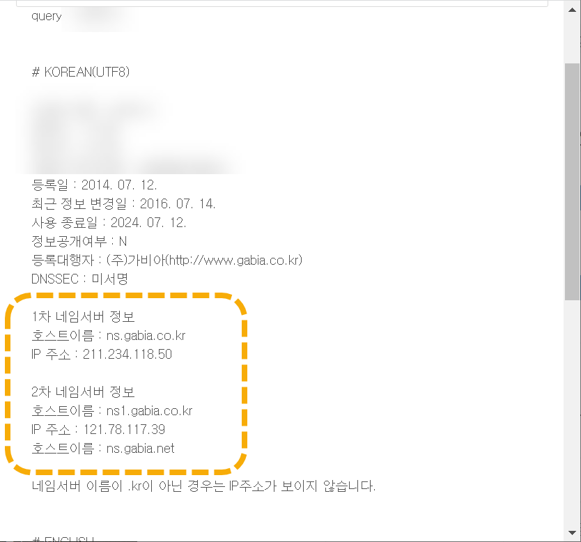 실제로 최근 변경 신청을 한 후 12시간이 지나도 변경된 서버로 접속이 되지 않고 계속 "Forbidden" 에러가 발생하여, 혹시나 싶어 도메인의 네임서버를 체크해 보니 도메인의 네임서버가 카페24가 아닌 가비아로 설정되어 있는 것을 발견했습니다.