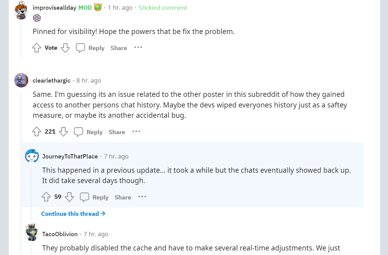 이와 관련하여 해외 커뮤니티를 살펴보니 다른 사람의 대화 기록에 접근할 수 있는 문제가 있었던 것 같습니다.