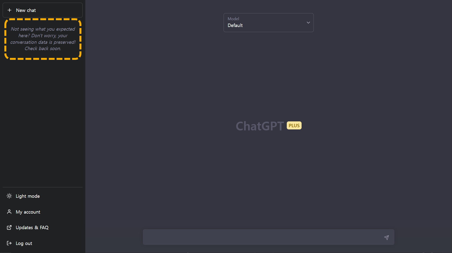 어제는 대화 목록이 표시될 곳에 아무런 내용이 표시되지 않았지만 오늘은 살펴보니 "Not seeing what you expected here? Don't worry, your conversation data is preserved! Check back soon (원하는 내용이 표시되지 않나요? 걱정하지 마세요. 대화 데이터가 보존되어 있습니다! 잠시 후 다시 확인하세요)" 메시지가 표시되네요.