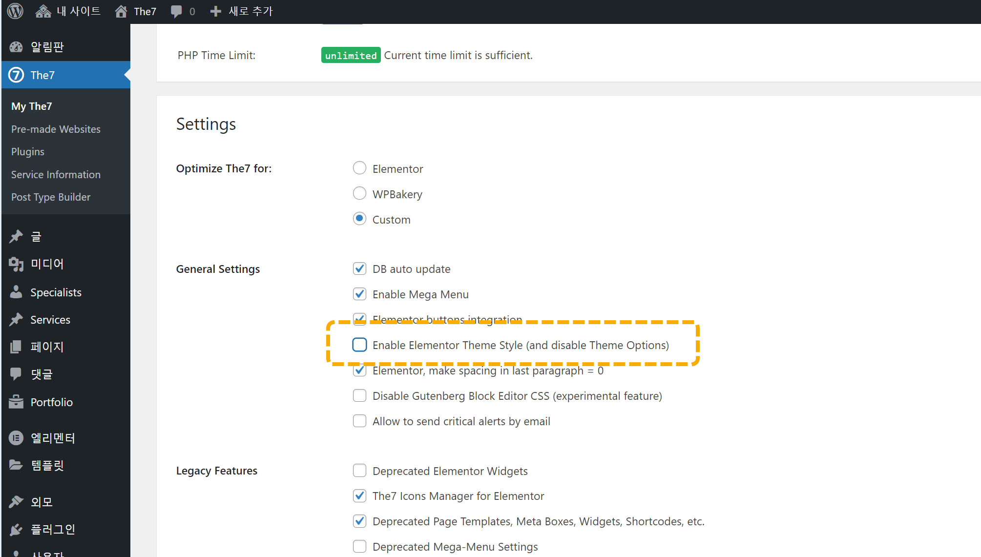 Optimize The7 for의 옵션을 Custom 대신 Elementor로 지정하면 Enable Elementor The Style.. 옵션은 기본적으로 선택되고 체크를 해제할 수 없습니다.