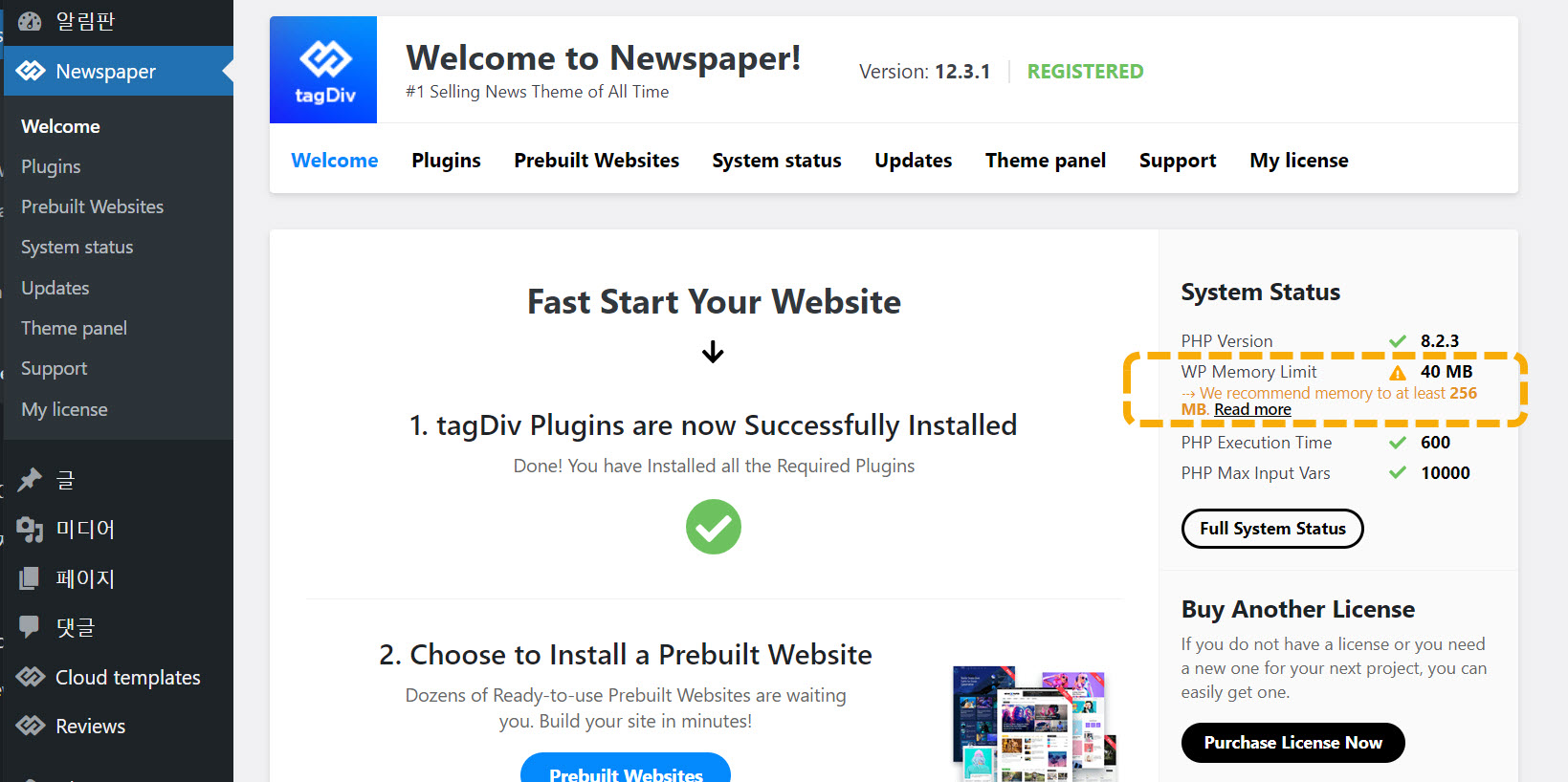 PHP 메모리 크기를 늘려도 인기 워드프레스 테마 중 하나인 뉴스페이퍼 테마의 시스템 상태(System Status)에서 WP Memory Limit가 40 MB 크기로 표시되고 We recommend memory to at least 256 MB (256MB 이상 크기로 메모리를 설정하는 것이 좋습니다) 알림이 표시됩니다.