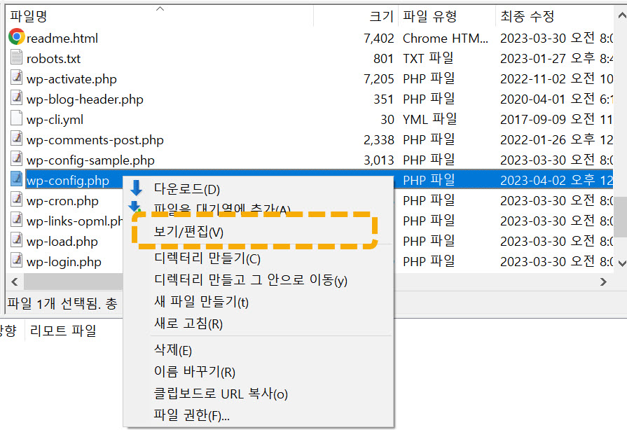 2. [**wp-config.php**] 파일을 선택하고 마우스 오른쪽 버튼을 클릭하여 보기 및 편집을 클릭합니다(파일질라 기준).