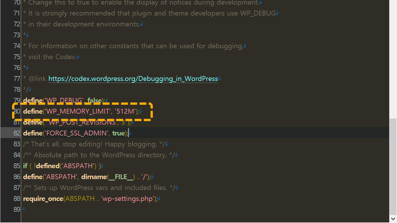 3. [**wp-config.php**] 파일이 텍스트 에디터에서 열리면 [**/* That's all, stop editing! Happy blogging. */**] 라인을 찾아서 바로 위의 위에 다음 라인을 추가합니다.