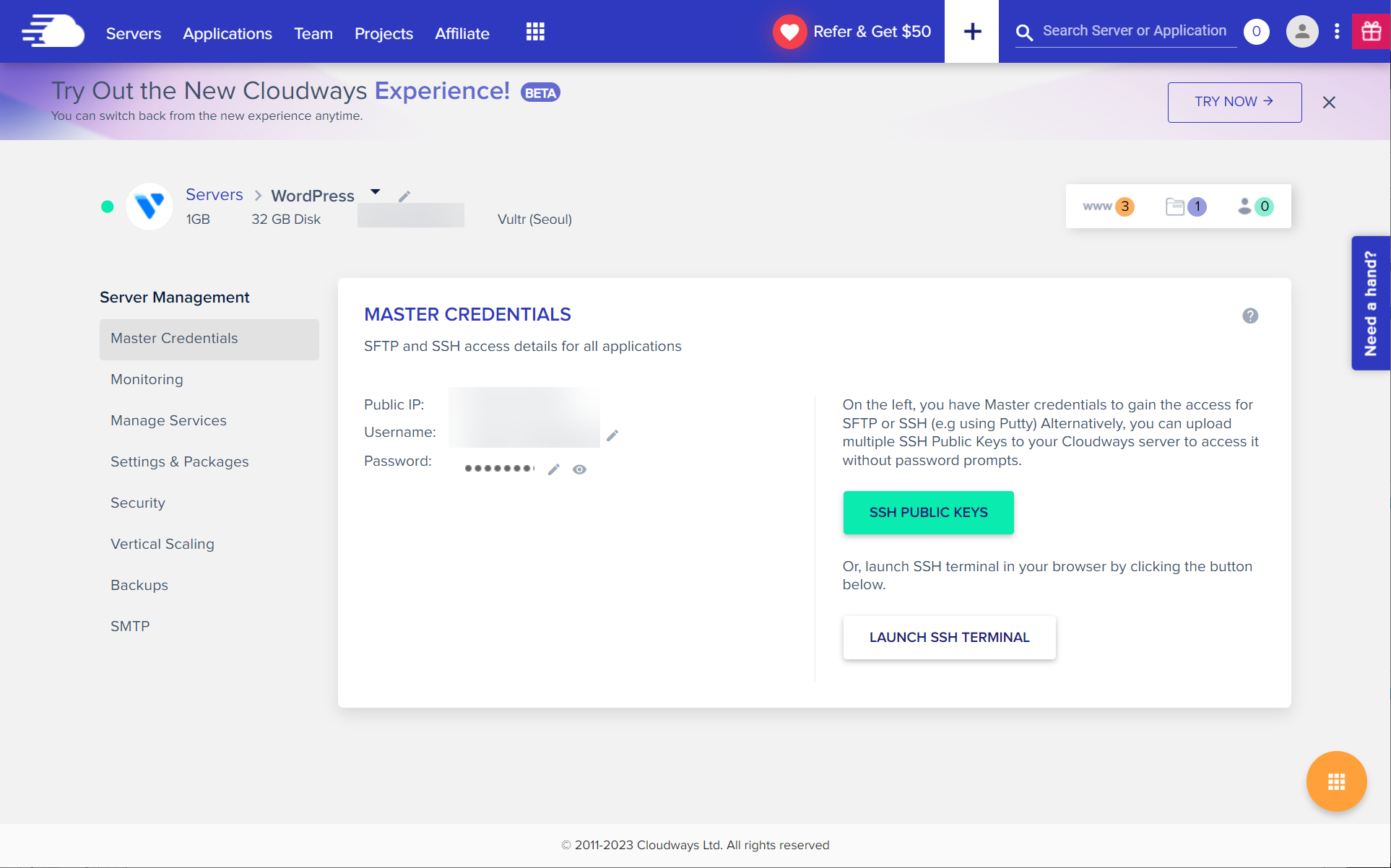 새로운 관리자 인터페이스로 전환하려면 Try Out the New Cloudways Experience! 옆에 있는 Try Now 버튼을 클릭하면 됩니다.