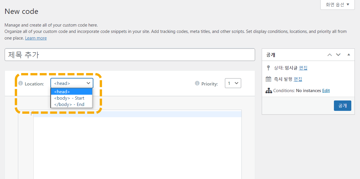 새 Custom Code 추가 버튼을 클릭하면 새 코드를 추가하는 페이지가 표시됩니다. Location(위치)을 <head>, <body> - Start, </body> - End 중에서 선택할 수 있습니다.