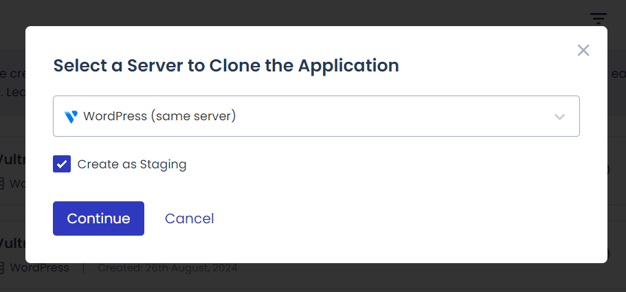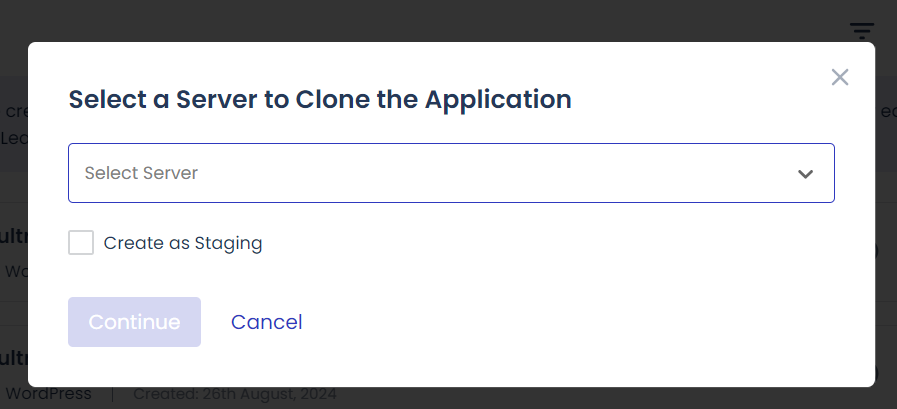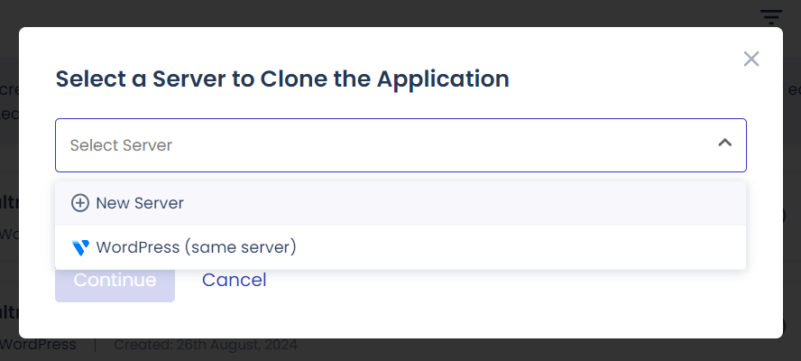 그러면 애플리케이션이 복제될 서버를 선택하는 팝업이 표시됩니다.