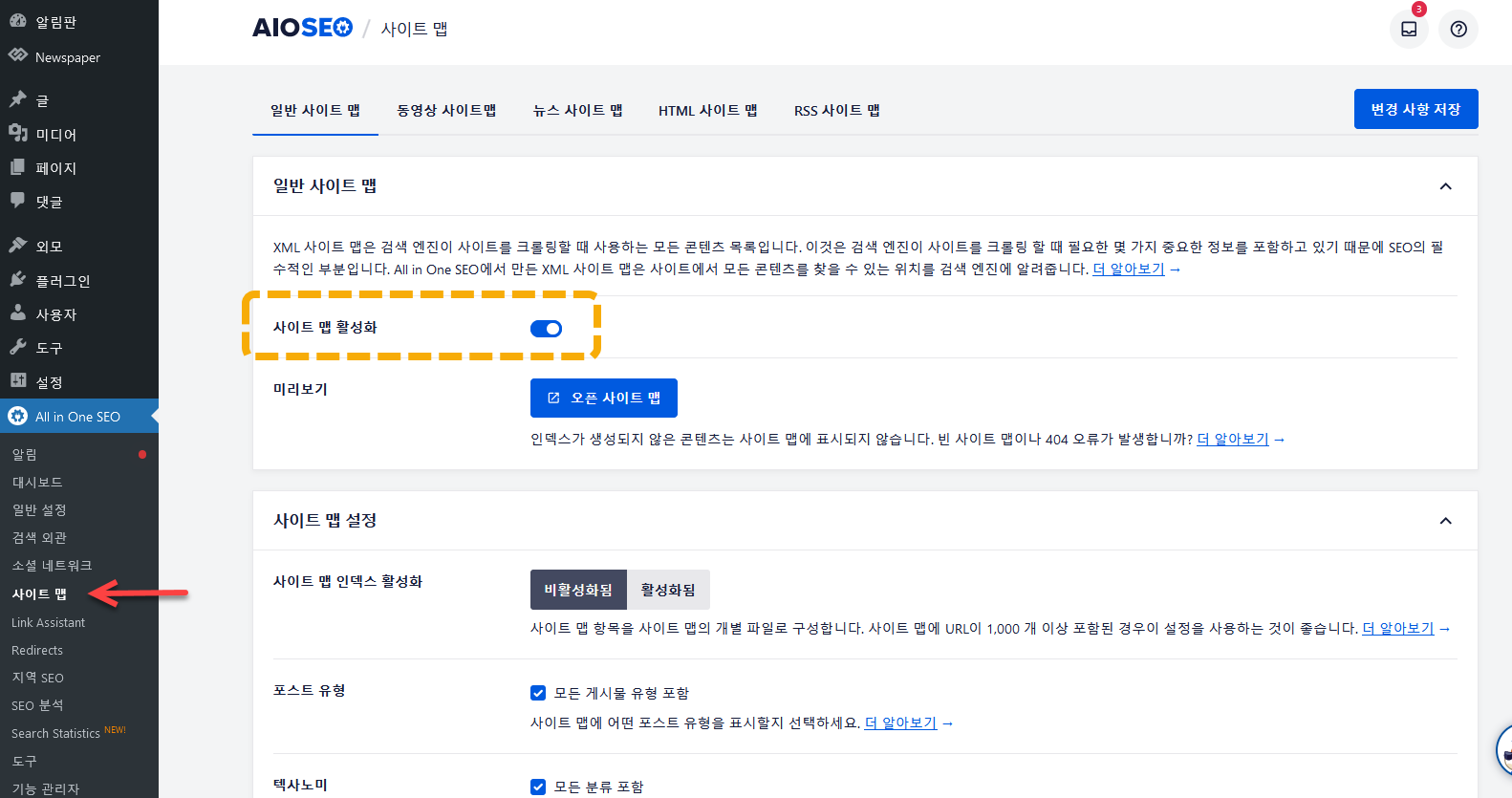 AIO SEO 플러그인을 사용하는 경우 워드프레스 관리자 페이지 » All in One SEO » 사이트 맵에서 사이트맵을 활성화/비활성화할 수 있습니다.