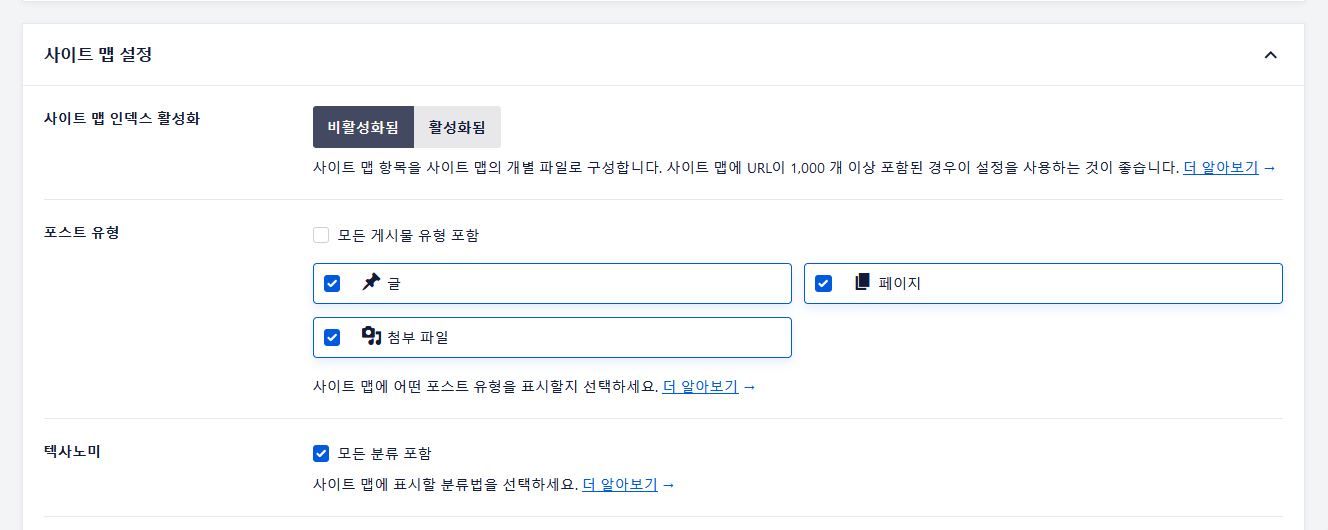 기본적으로 모든 게시물 유형(포스트 타입)이 사이트맵에 포함됩니다. 원하는 경우 특정 포스트 타입만 사이트맵에 포함하도록 설정할 수 있습니다. 예를 들어, 모든 게시물 유형 포함 체크박스의 체크를 해제하면 개별 포스트 타입에 대하여 사이트맵에 추가할지 여부를 지정할 수 있습니다.