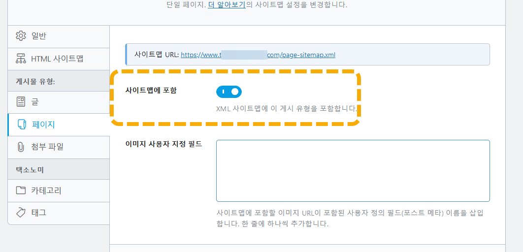 사이트맵 설정에서 상세한 설정이 가능합니다. 예를 들어, 특정 포스트 타입의 글들을 사이트맵에 표시할지 여부를 지정할 수 있습니다. 예를 들어, 페이지를 사이트맵에 포함시킬지 여부를 게시물 유형 » 페이지에서 설정하는 것이 가능합니다.