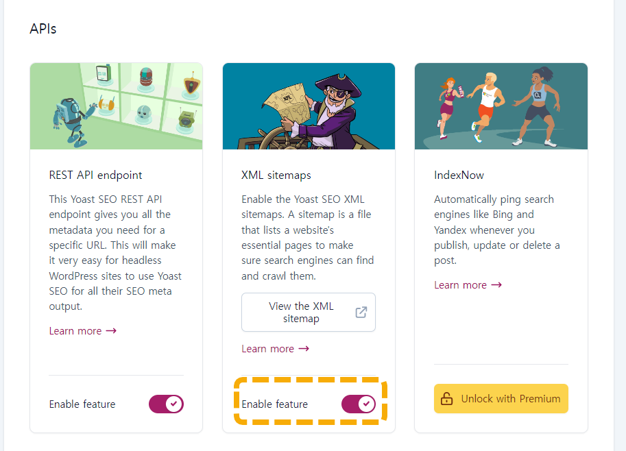 아래로 스크롤하여 APIs의 XML siemaps를 활성화하면 사이트맵이 활성화됩니다.