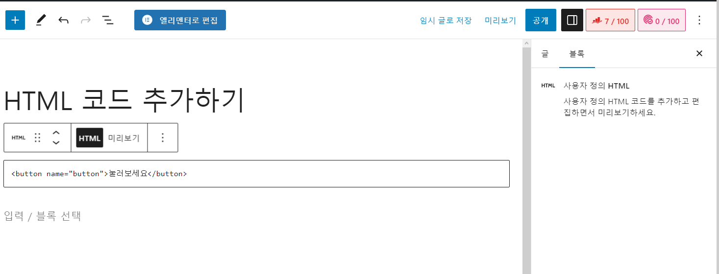 사용자 정의 HTML 블록에 원하는 HTML 코드를 추가하도록 합니다.