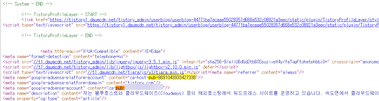티스토리 블로그의 페이지 소스에서 pub-으로 검색해 보면 두 가지 pub 코드가 삽입되어 있는 것을 확인할 수 있습니다. 하나는 블로그 운영자의 pub 코드이고 다른 하나는 카카오의 pub 코드 같습니다.