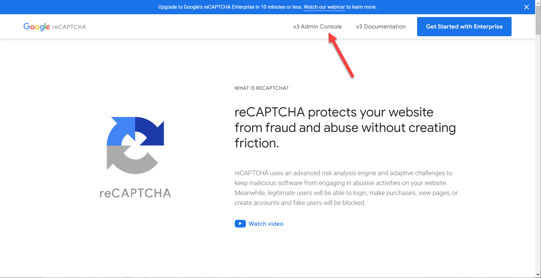 구글 reCAPTCHA 사이트에 접속되면 상단의 v3 Admin Console을 클릭합니다.