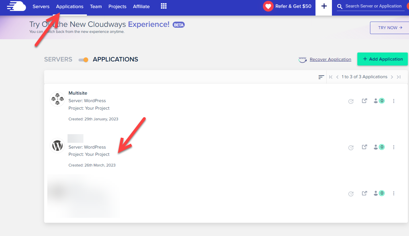 클라우드웨이즈 어드민 패널에 로그인한 다음, Applications 메뉴를 선택하고 사이트 주소를 변경할 사이트(애플리케이션)를 선택합니다.