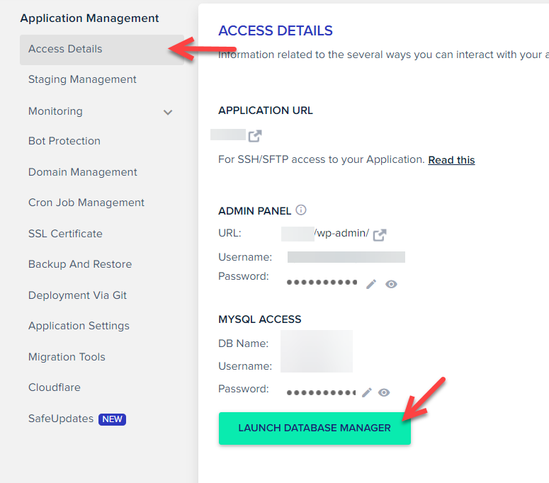 Application Management(애플리케이션 관리) 페이지의 Access Details(액세스 상세 정보)에서 하단에 있는 Launch Database Manager(데이터베이스 매니저 시작) 버튼을 클릭합니다.