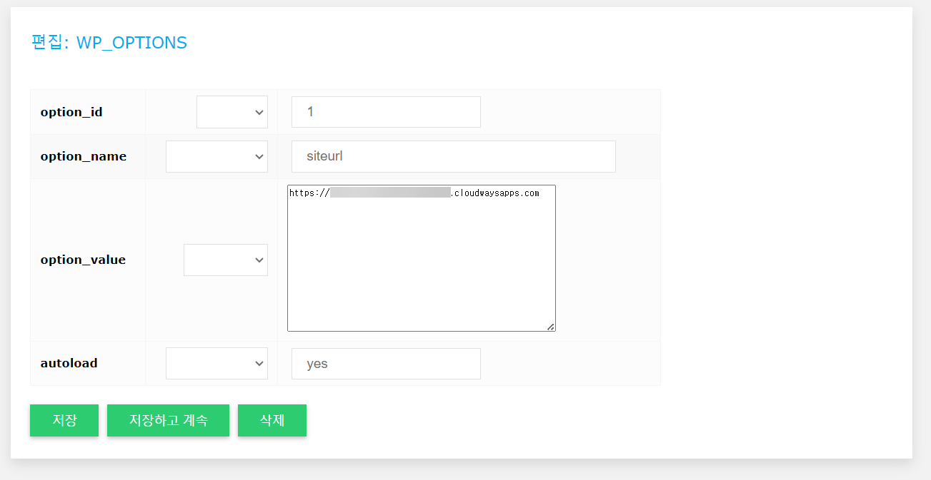 편집 화면에서 [**option_value**] 값을 수정합니다. site_url과 home 필드를 모두 수정하도록 합니다.