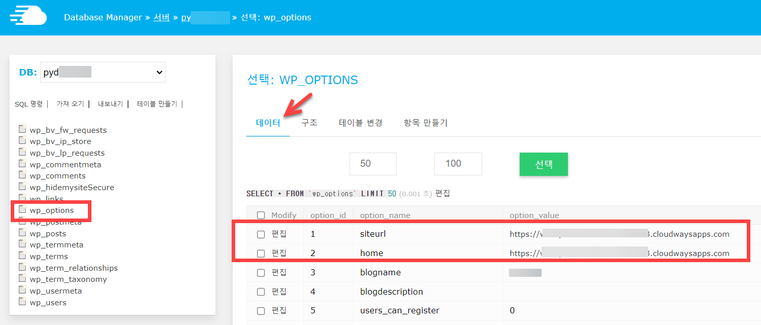 클라우드웨이즈에서 워드프레스 사이트 주소를 DB에서 변경하는 방법에 대하여 살펴보겠습니다.