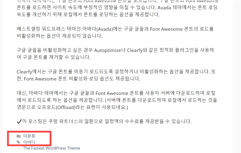 그러면 위의 그림과 같이 최신 글 페이지와 아카이브 페이지(카테고리 페이지, 태그 페이지 등)에서 카테고리, 태그 등의 메타 항목들이 사라집니다. 보다 세부적으로 카테고리, 태그, 댓글 링크만 제거하는 것도 가능합니다. 예를 들어, 카테고리 항목만 제거하려는 경우 다음과 같은 코드를 사용할 수 있습니다.