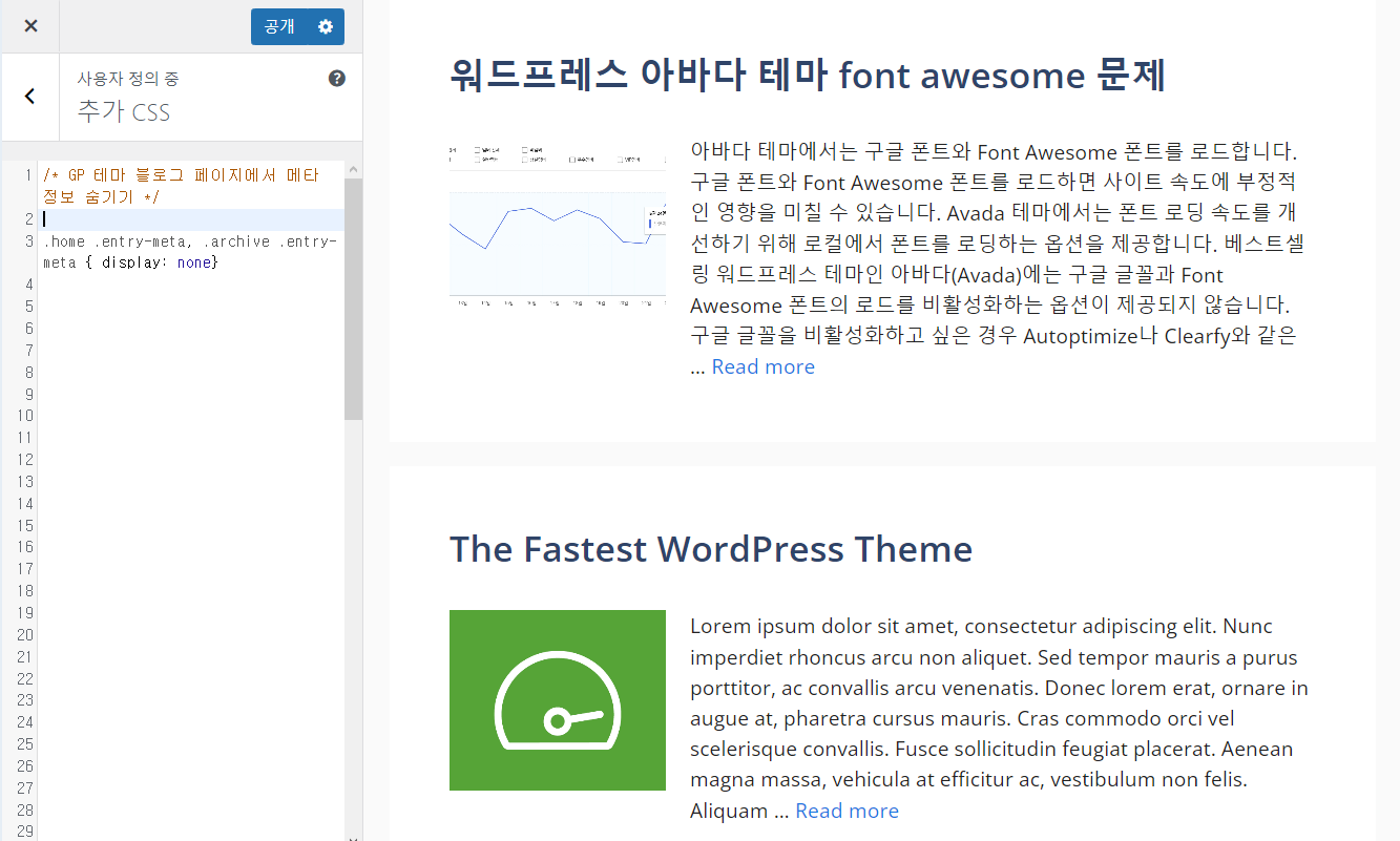 위의 코드를 알림판 » 외모 » 사용자 정의하기 » 추가 CSS에 추가하도록 합니다.