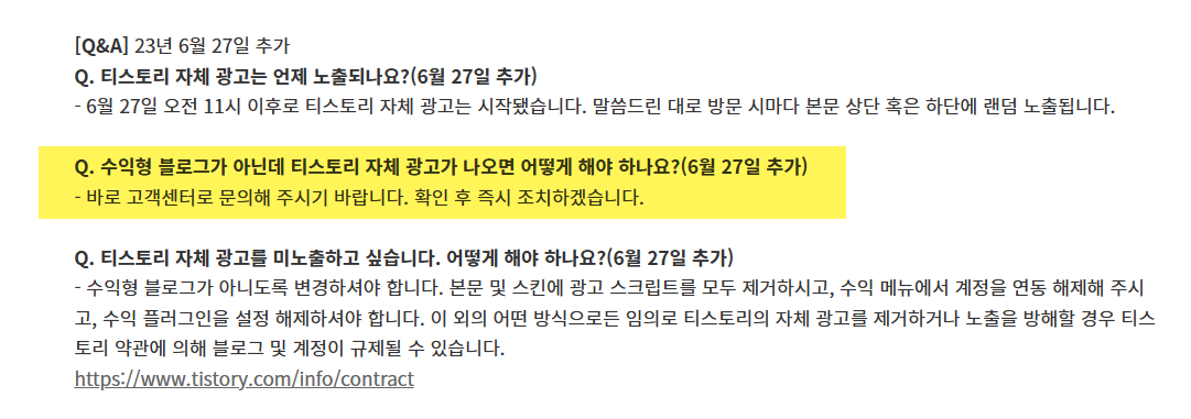 수익형 블로그가 아닌데 티스토리 자체 광고가 나오는 경우에는 고객센터로 문의해 달라고 하네요.