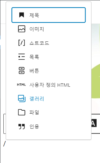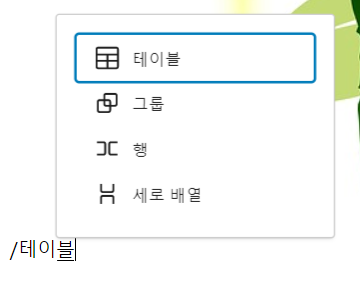 참고로 블록 에디터에서 블록을 삽입할 때에는 슬래시([**/**])를 입력하면 자주 사용하는 블록들이 표시됩니다.