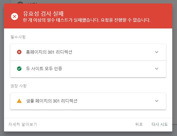 301 리다이렉트가 올바르게 설정되지 않으면 유효성 검사에 실패하게 되고 주소 변경 신청을 할 수 없습니다.