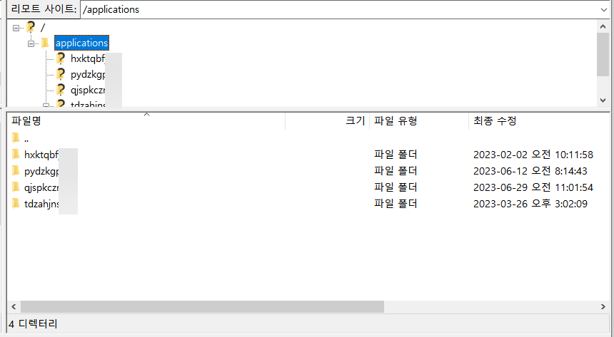 클라우드웨이즈를 사용하는 경우 여러 개의 워드프레스 사이트나 애플리케이션을 설치하면 SFTP로 접속 시 [**applications**] 폴더 아래에 여러 개의 디렉터리가 존재하게 됩니다.