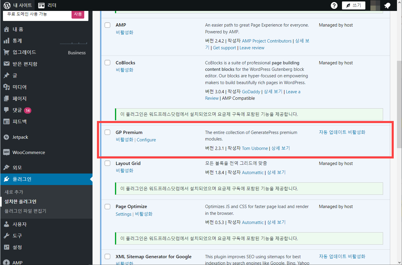 플러그인 » 설치한 플러그인에서 플러그인을 활성화/비활성화할 수 있습니다.