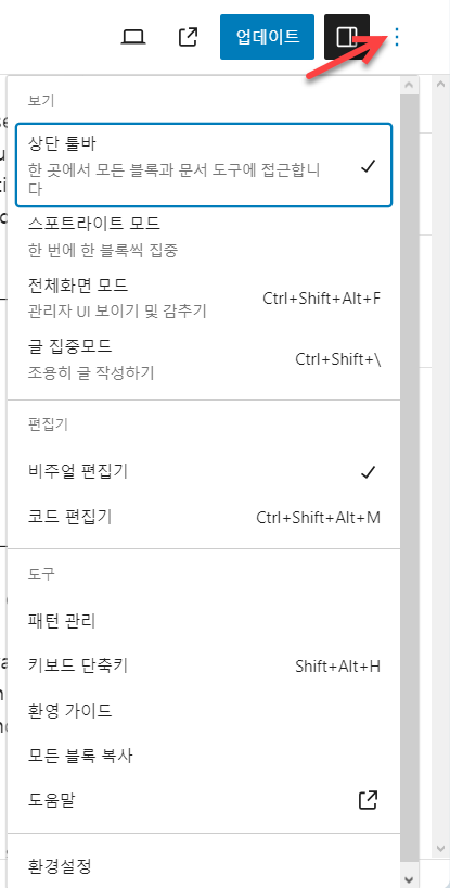 편집 화면에서 오른쪽 모서리에 있는 옵션 아이콘(점 세 개로 된 아이콘)을 클릭하고 보기 섹션에서 상단 툴바를 선택합니다.
