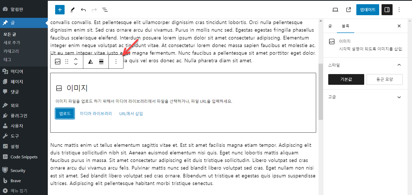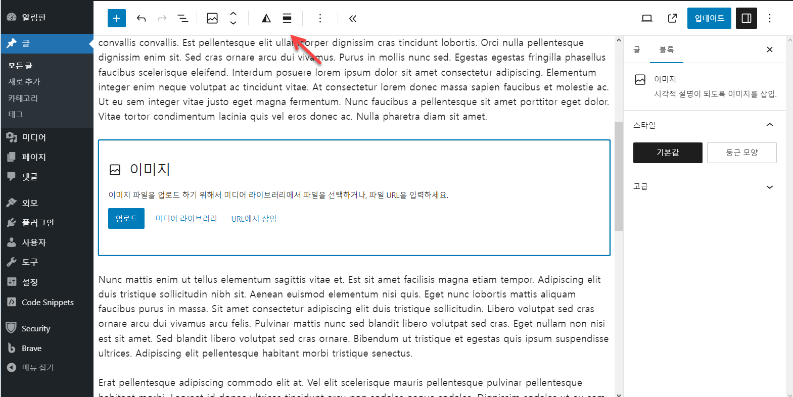 블럭 툴바는 선택하는 블럭에 따라 표시되는 항목이 조금씩 다릅니다. 아래는 이미지 블럭을 추가할 때의 블럭 툴바를 보여줍니다.
