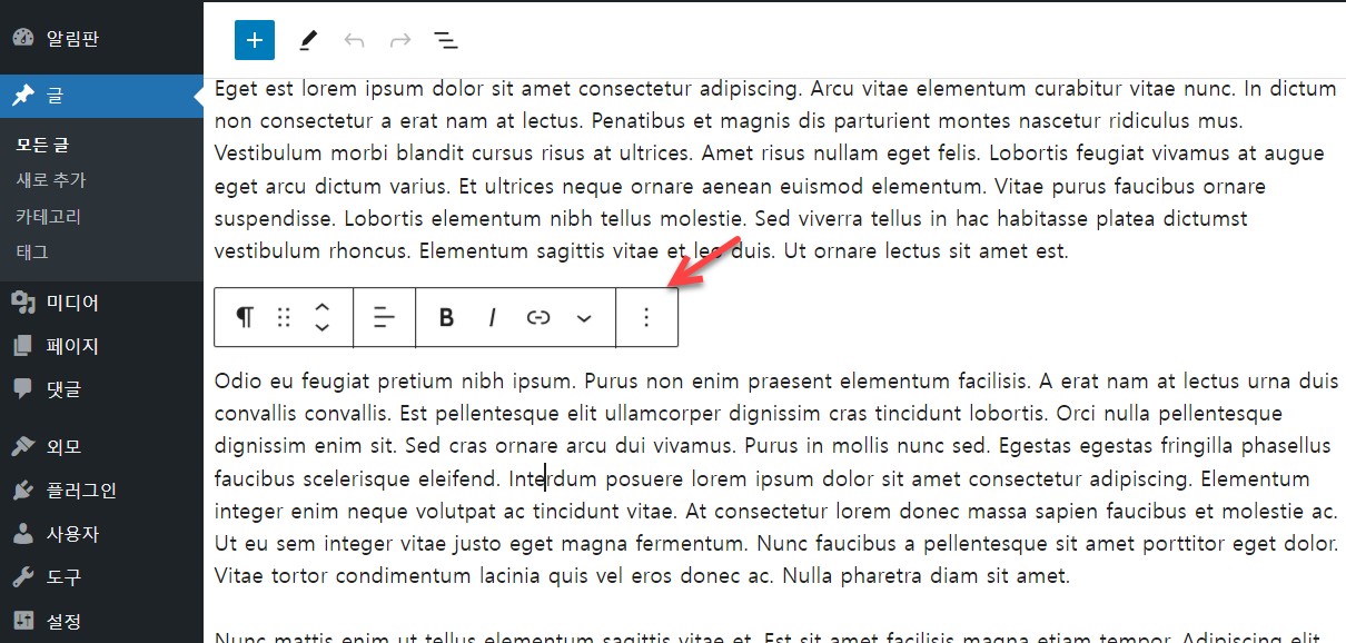 구텐베르크(블럭 편집기)를 사용할 때 블럭을 선택하면 아래 그림과 같이 블럭 바로 위에 블럭 툴바가 표시될 수 있습니다.