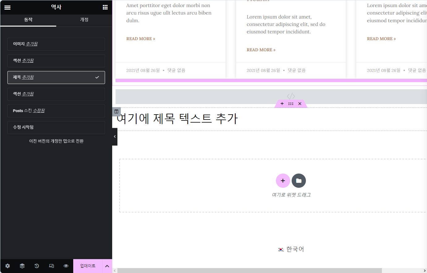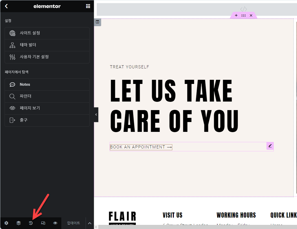 동작을 취소하거나 이전 버전으로 복구하고 싶은 경우 왼쪽 하단의 내역(History) 아이콘을 클릭합니다. (참고로 엘리멘터 한글 버전에서는 History가 "역사"로 번역되어 있습니다. 자동 번역기를 사용하여 번역했거나 번역가가 잘못 번역한 것 같습니다.)