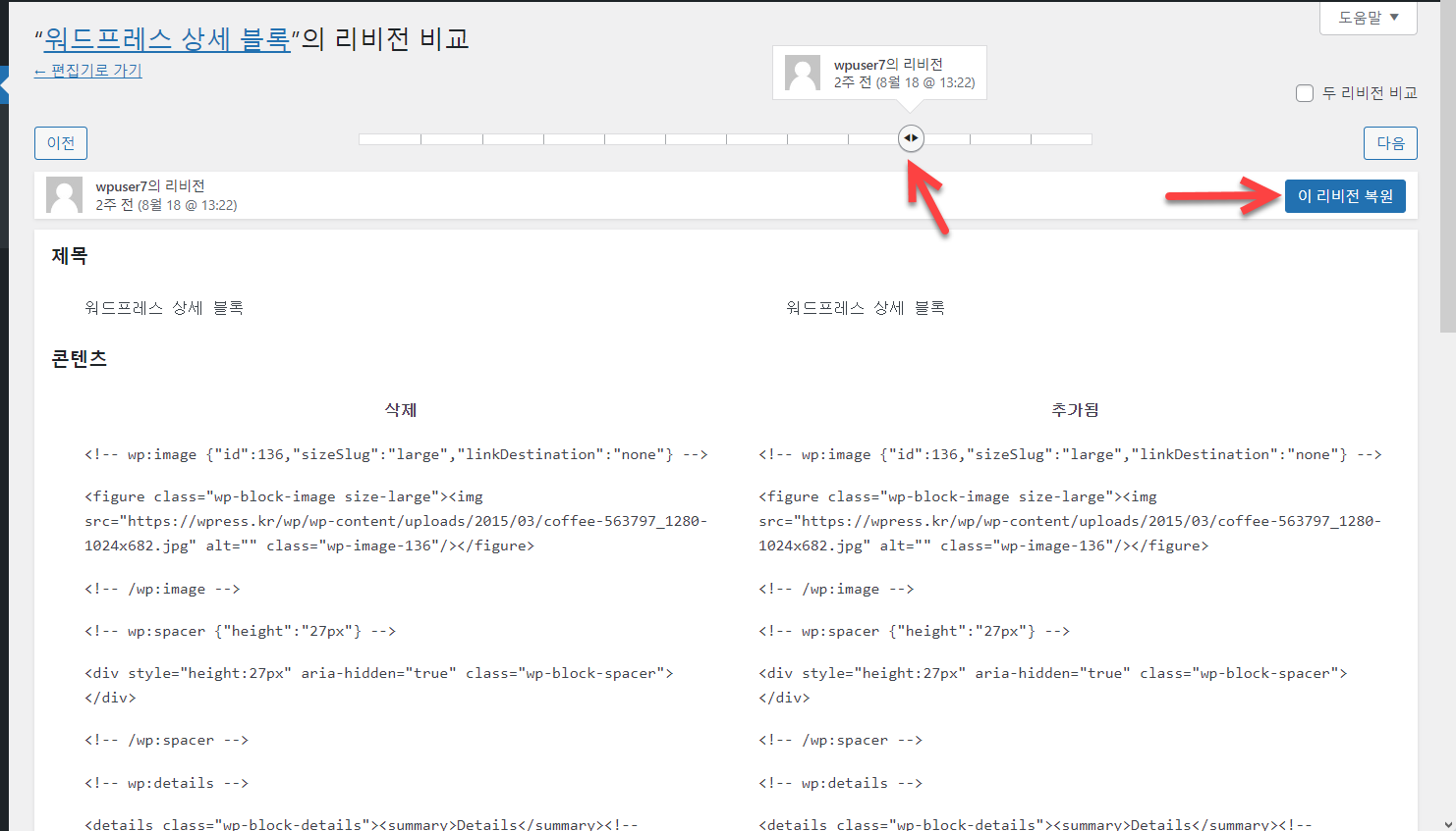 상단의 슬라이더를 끌어서 원하는 리비전으로 선택하고 "이 리비전 복원" 버튼을 누르면 선택한 리비전이 적용됩니다.