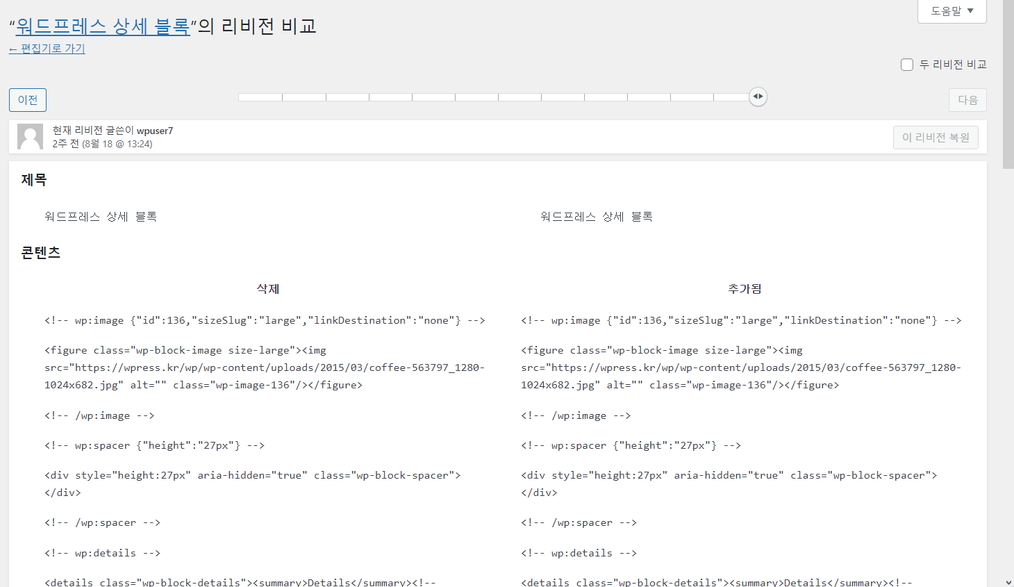 워드프레스 페이지나 포스트도 리비전을 사용하여 과거 버전으로 되돌릴 수 있습니다.