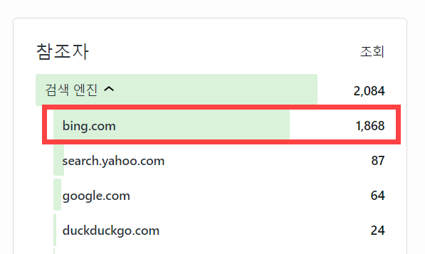 제가 운영하고 있는 대부분의 워드프레스 사이트에서도 1~2% 정도 빙(Bing)에서 유입되고 있습니다. 하지만 한 워드프레스 사이트에서는 대부분의 유입이 빙(Bing)에서만 발생하고 있습니다.