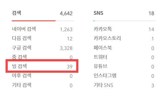 대부분 사이트의 경우 구글, 네이버, 다음 등의 검색엔진에서 방문자 유입이 많고 마이크로소프트 빙(Bing) 검색엔진을 통해서는 유입이 거의 없을 수 있습니다.