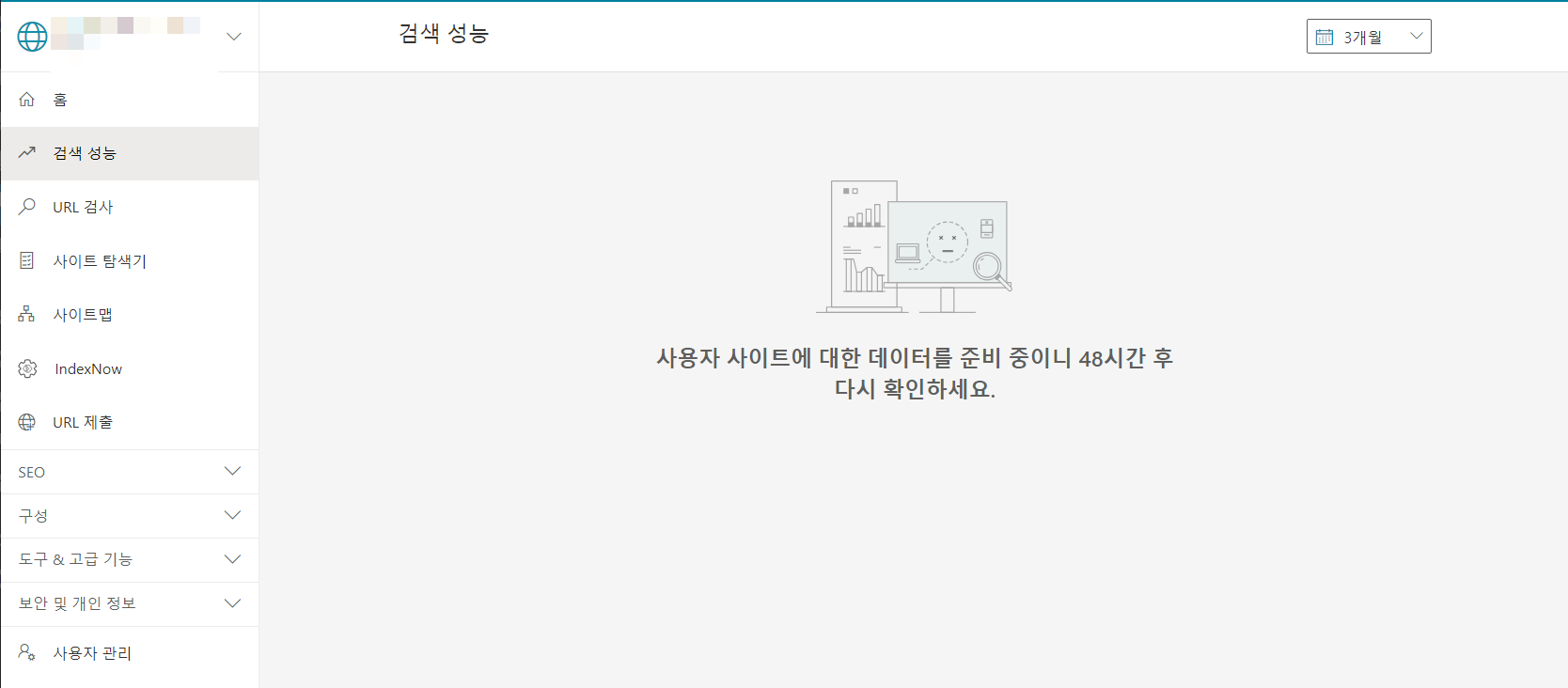 사이트를 신규로 추가한 경우 "사용자 사이트에 대한 데이터를 준비 중이나 48시간 후 다시 확인하세요" 메시지가 표시됩니다.