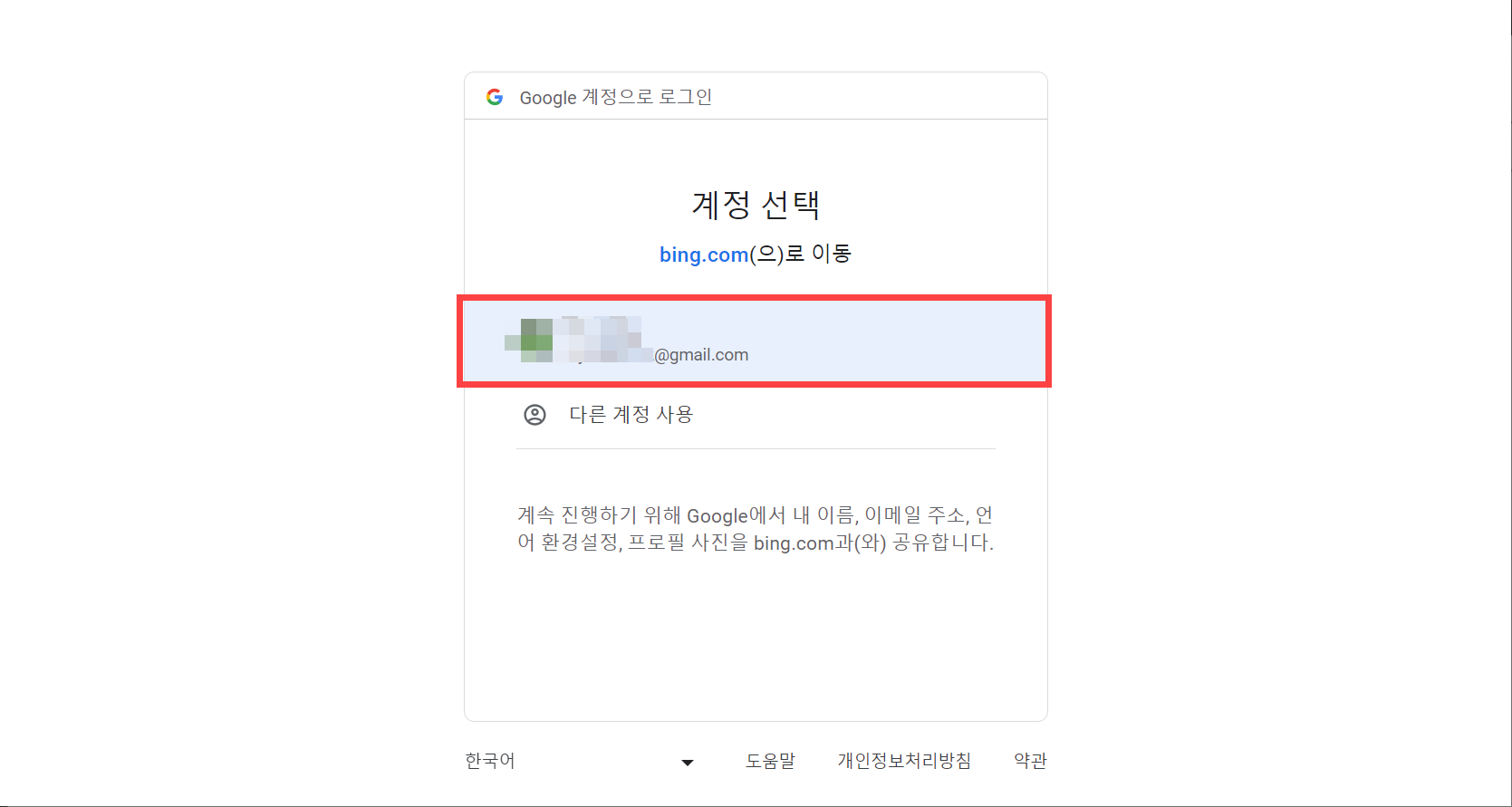 계정 선택 화면이 표시되면 구글 계정을 선택합니다. 다른 구글 계정과 연동하려면 다른 계정 사용을 클릭하여 구글 로그인 정보를 입력하여 로그인합니다.
