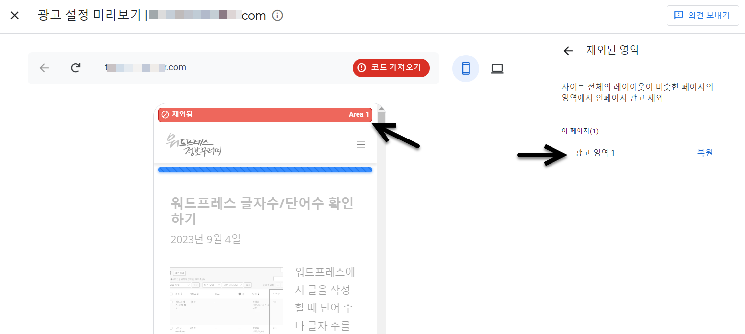 광고 설정 화면에서 광고 삭제 아이콘을 클릭하여 광고 영역을 삭제하는 것도 가능합니다. 광고 설정 화면에서는 현재 사이트에서 표시되는 광고 위치만 표시되고, 제외된 영역 탭을 클릭하면 표시될 수 있는 모든 광고 위치가 표시되는 것 같습니다.