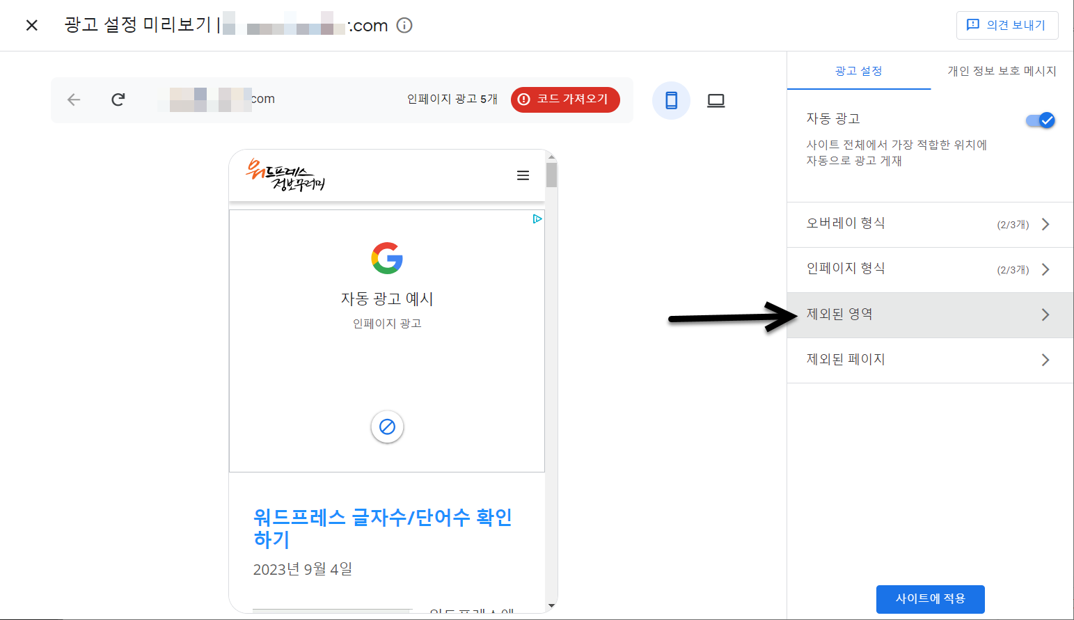 변경 사항을 적용하려면 오른쪽 상단의 "← 제외된 영역"을 클릭하여 광고 설정 화면으로 이동한 다음, 하단의 사이트에 적용 버튼을 클릭합니다.