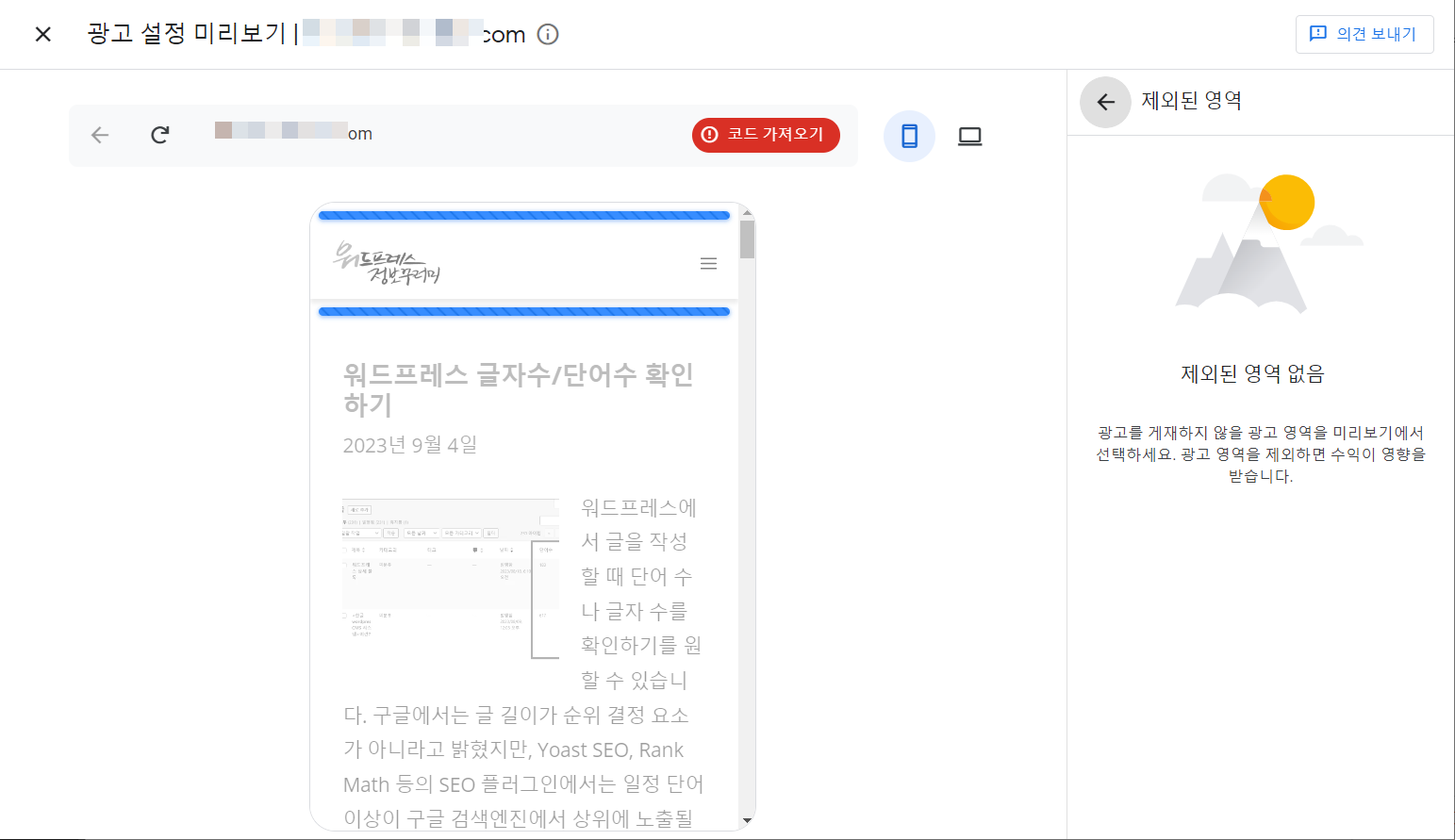 위와 같이 표시되는 화면에서 광고를 삭제해도 해당 영역이 제외된 영역에 추가되면서 광고가 게재되지 않습니다.