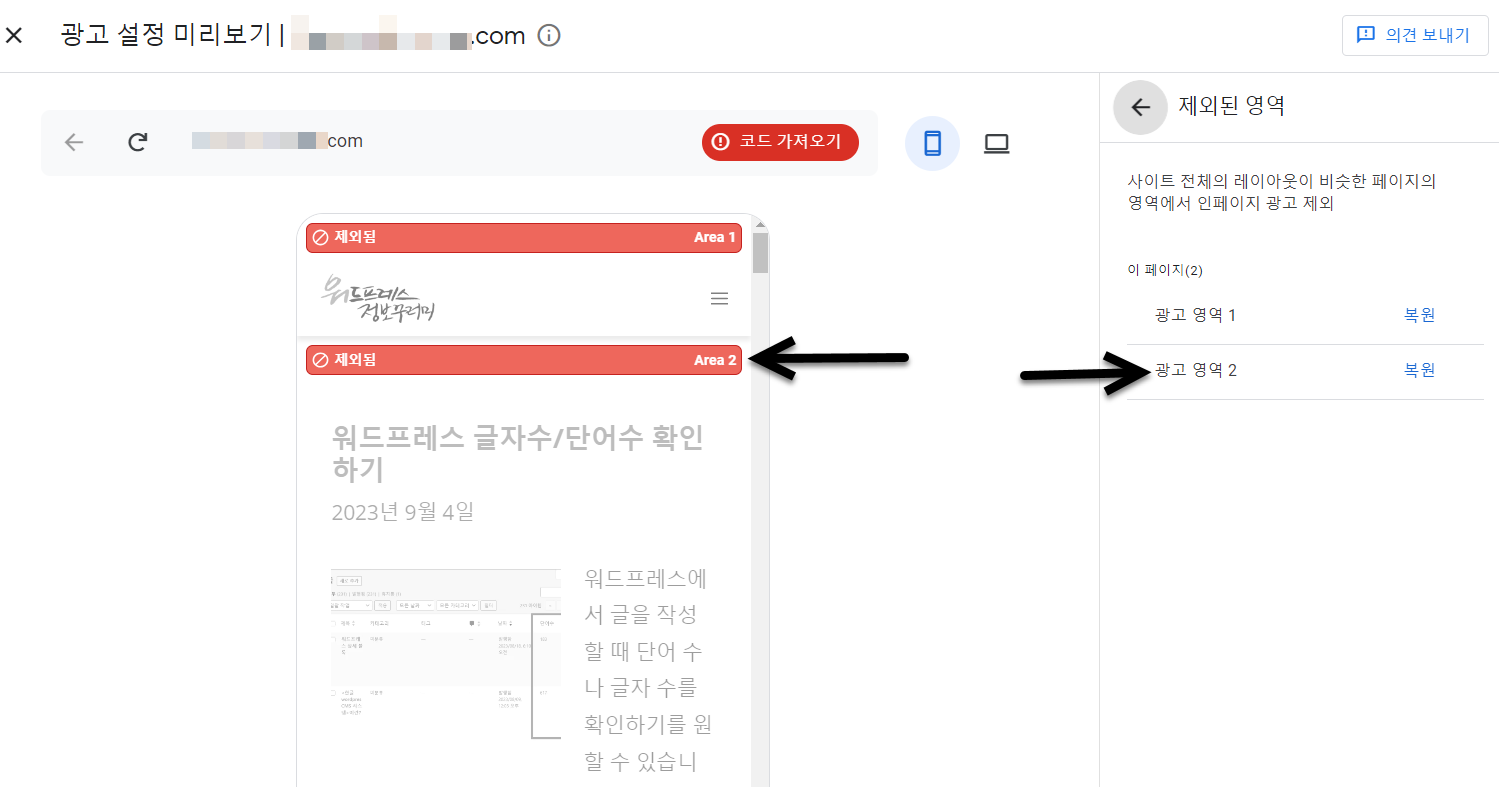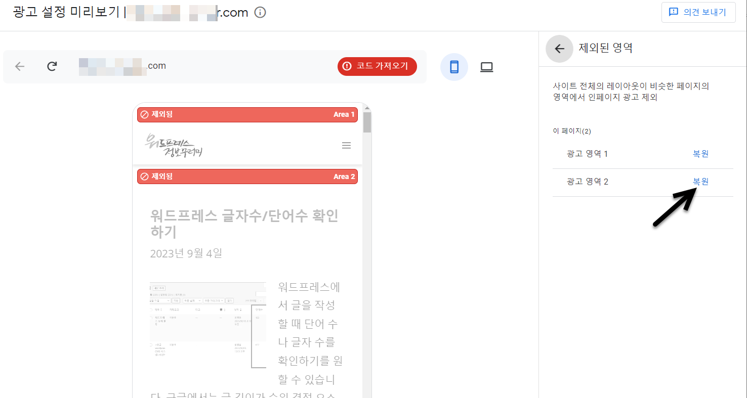제외된 광고 영역을 복원하려면 광고 설정의 제외된 영역 탭을 클릭하여 제외된 영역 페이지로 이동합니다.