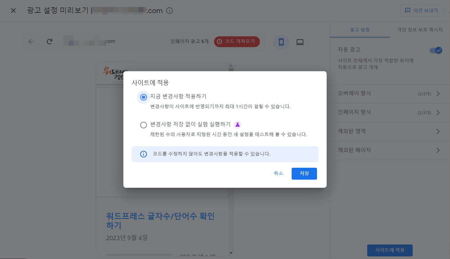 [참고*구글에서는 변경사항이 반영되는 데 최대 1시간 정도 걸릴 수 있다고 안내하지만 실제 자동 광고의 적용은 하루 정도 걸릴 수 있다고 하니 적용 후에 하루 정도 기다려 보시기 바랍니다.*]