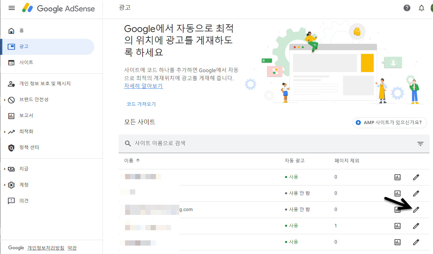 2. 사이트 목록이 나와 있는 화면에서 광고 위치를 수정할 사이트 이름의 맨 오른쪽에 있는 편집 아이콘(연필 모양의 아이콘)을 클릭합니다.