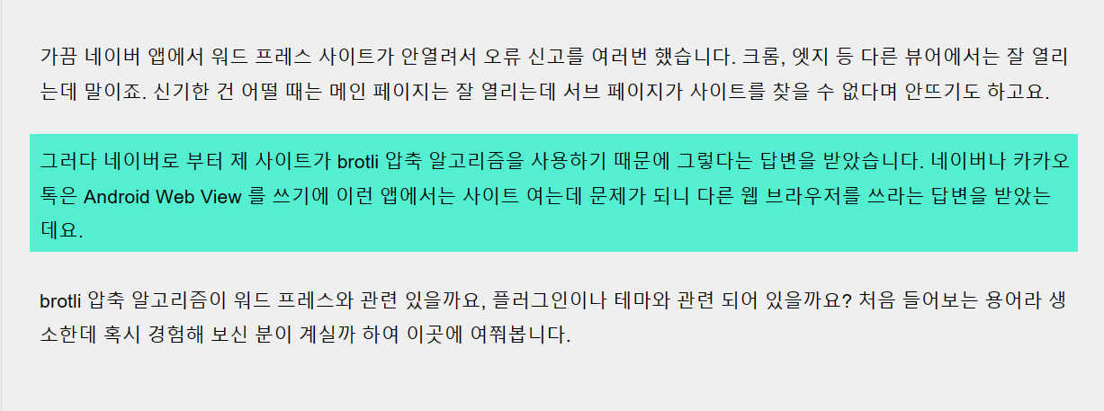 네이버에 이 문제를 문의하여 Brotli 압축 알고리즘을 사이트에서 사용하기 때문에 이와 같은 문제가 발생한다는 답변을 받았다고 하네요. 만약 네이버 앱에서 사이트가 열리지 않는 문제가 발생한다면 웹호스팅 레벨에서 Brotli 압축이 활성화되어 있지 않은지 체크해 보시기 바랍니다.