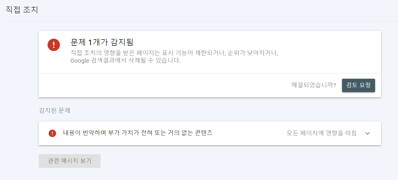 위와 같이 직접 조치가 이루어지는 경우 "직접 조치의 영향을 받은 페이지는 표시 기능이 제한되거나, 순위가 낮아지거나, Google 검색결과에서 삭제될 수 있습니다."