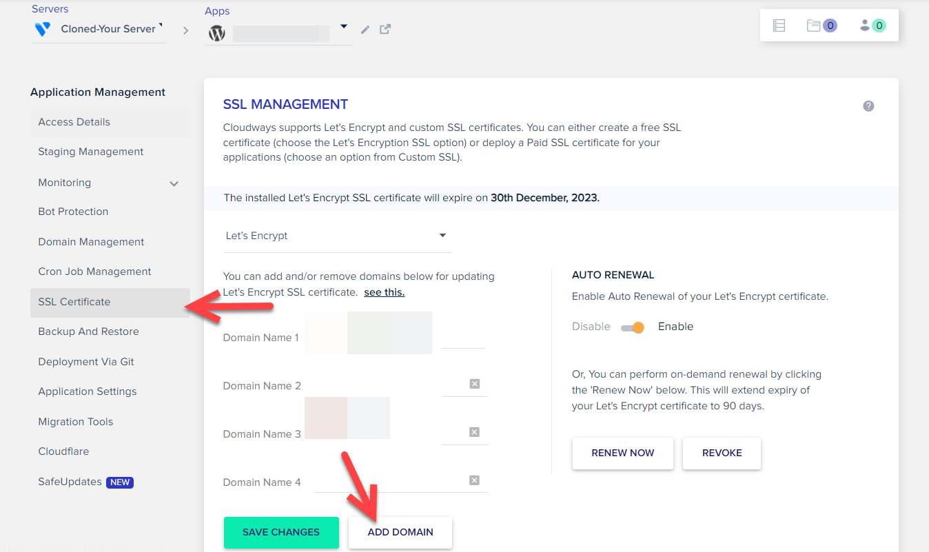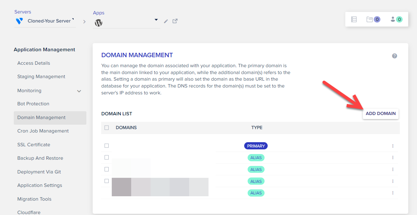 이제 클라우드웨이즈의 애플리케이션에서 도메인을 추가하고 SSL 인증서를 설치합니다. DNS 레코드를 변경하면 반영되는 데 서너 시간에서 최대 48시간(2일)이 소요될 수 있습니다.