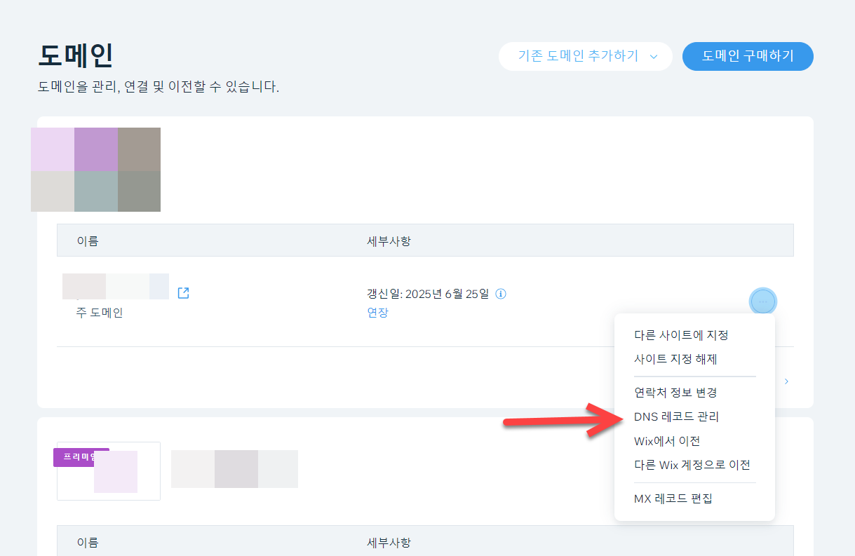 도메인 관리, 연결 및 이전을 할 수 있는 도메인 페이지가 표시됩니다. 타 사이트에 연결할 도메인의 맨 오른쪽의 아이콘을 누른 다음, DNS 레코드 관리를 클릭합니다.